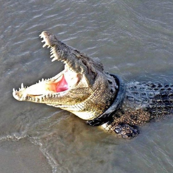 Bayangkan selama empat tahun badan korang tersangkut pada tayar motosikal tapi sorang pun tak tolong. Misi selamat buaya tayar diteruskan Pengacara televisyen Australia dan rakannya bantu dalam misi selamatkan buaya tersangkut tayar motosikal pada. Buaya sepanjang empat meter itu sering dilihat di sebatang sungai yang menyusuri ibu kota wilayah Sulawesi Tengah di sini sejak 2016.